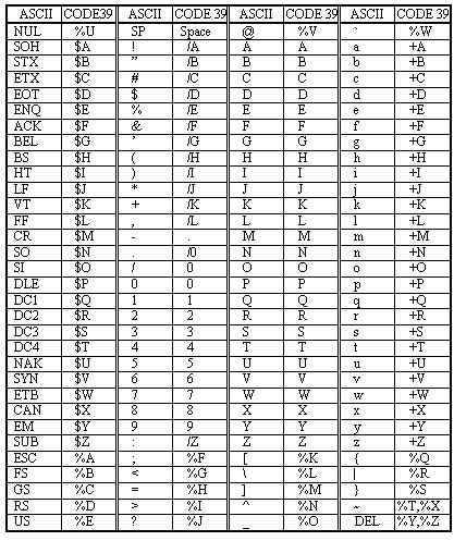 可表示的资料包含有:0~9的数字,A~Z的英文字母,以及“+”、“-”、“*”、“/”、“%”、“$”、“.”等特殊符号,再加上空白字符“ ”,共计44组编码,并可组合出128个ASCII CODE的字符符号,如下所示。